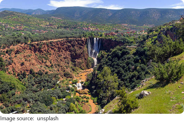 Morocco's tallest cascades plunge 110 m into a cool basin—pure summer relief. It's 3 hours by road (guided day tours $25–$45; private car with driver $90–$140 per vehicle). Wear grippy shoes for the switchback trail; boat punts at the base are $2–$4. Bring a dry bag for the spray and small bills for cafés near trail viewpoints.